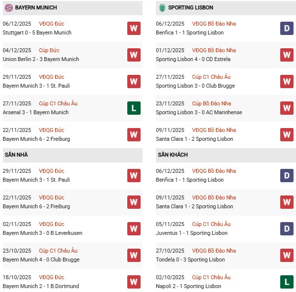 Thống kê phong độ Bayern vs Sporting Lisbon: