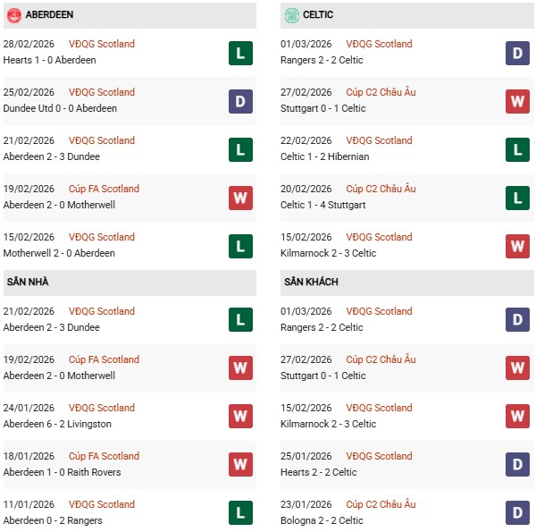 Phong độ 10 trận gần nhất của họ là 3 thắng, 1 hòa, 6 thua – thiếu tính ổn định và thường xuyên gặp vấn đề ở khâu phòng ngự. Trên sân nhà, Aberdeen thắng 4, hòa 3, thua 3 trong 10 trận gần đây, một thống kê không quá tệ nhưng khó tạo niềm tin khi phải tiếp đón đối thủ có đẳng cấp vượt trội như Celtic.