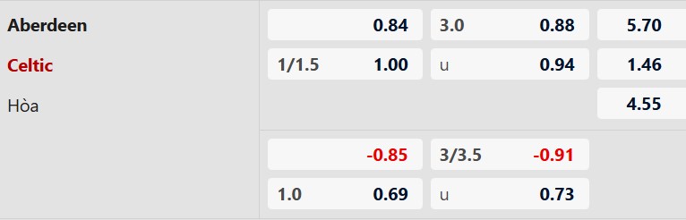 Thông tin tỷ lệ kèo Aberdeen vs Celtic: