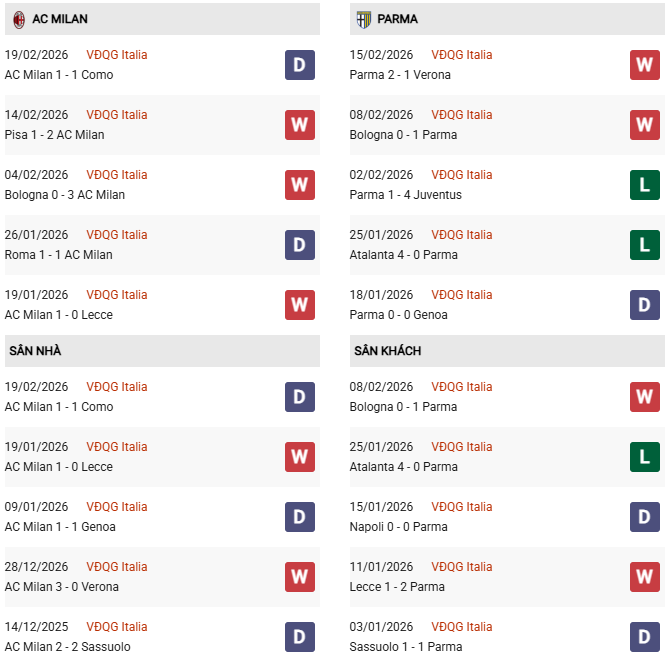 - Trên sân nhà, AC Milan thắng 8, thua 1 trước Parma.