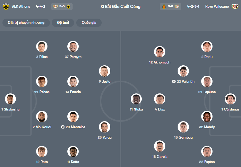 Đội hình dự kiến AEK Athens vs Vallecano: