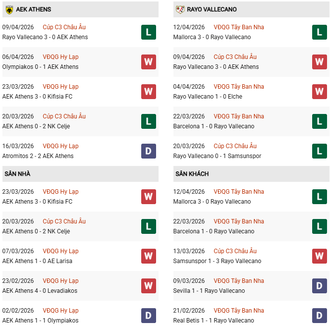 Thống kê phong độ AEK Athens vs Vallecano: