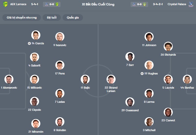 Đội hình dự kiến AEK Larnaca vs Crystal Palace: