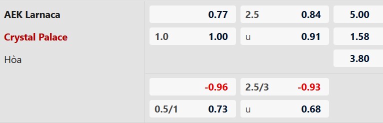 Thông tin tỷ lệ kèo bóng đá AEK Larnaca vs Crystal Palace: