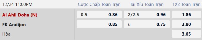 Thông tin tỷ lệ cược Al Ahli Doha vs Andijon: