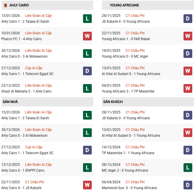 - Al Ahly thắng 5, hòa 2, thua 1 trong 8 trận gặp Young Africans gần đây.