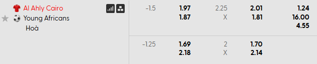 Al Ahly chấp 1 1/2 bàn cả trận. Tuy nhiên, với việc Young Africans chưa để lọt lưới bàn nào (0 bàn thua) thì khả năng thắng kèo cách biệt cho Al Ahly là không hề dễ dàng. Young Africans đã thắng kèo châu Á ở cả 2 trận vòng bảng vừa qua nhờ lối chơi kín kẽ. Trong một trận đấu mà đội khách chủ động tử thủ, lựa chọn Young Africans ở mức chấp sâu có thể mang lại sự an toàn cao hơn.