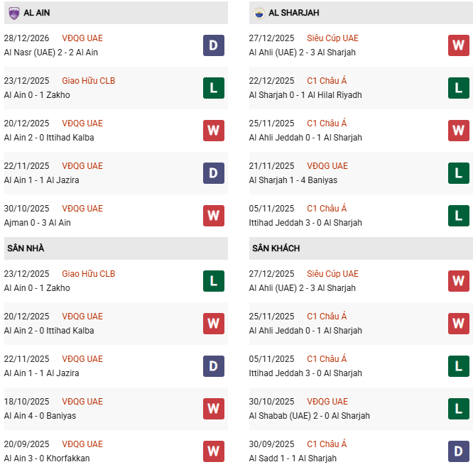 Thống kê phong độ Al Ain vs Al Sharjah:
