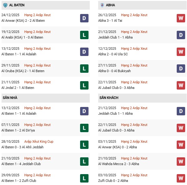 - Al-Baten thắng 5, hòa 1, thua 4 trong 10 trận gặp Abha gần đây.