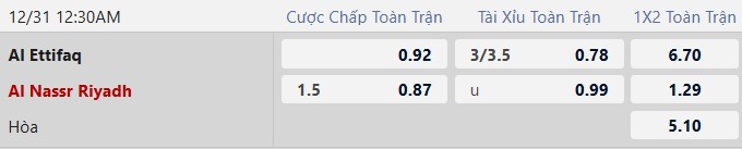Thông tin tỷ lệ bóng đá Al Ettifaq vs Al Nassr: