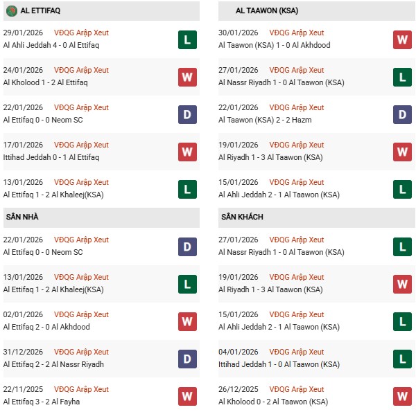 Từ đầu Saudi Pro League 2025/26 đến giờ, Al Taawoun chưa một lần gây thất vọng cho NHM khi làm khách ("thắng" 7/9 trận). Ngoài ra, 4/5 cuộc viếng thăm EGO gần đây tại giải VĐQG Saudi Arabia, Al Taawoun đều ra về với niềm vui trọn vẹn. Như vậy, chủ nhà Al Ettifaq mà hòa được trận này thì đã có thể xem là thành công, chỉ sợ họ sẽ không được toại nguyện.