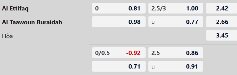 Thông tin tỷ lệ cược Al Ettifaq vs Al Taawoun: