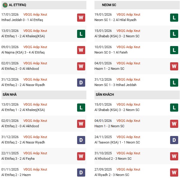 Thành tích đối đầu Al Ettifaq vs Neom: