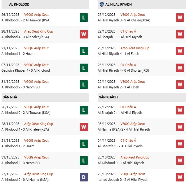 - Al Kholood thua cả 2 trận đối đầu Al Hilal gần đây.