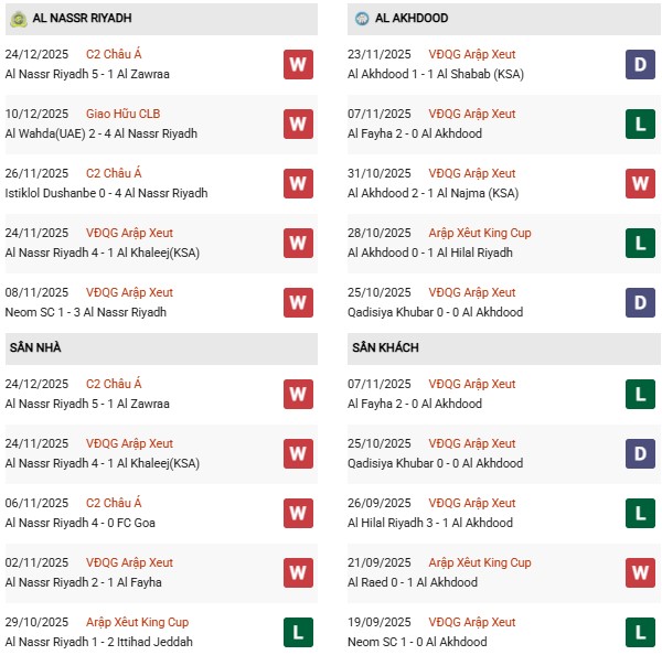 Xét về phong độ gần đây, Al Nassr duy trì thành tích hoàn hảo, thắng cả 5 trận gần nhất trên mọi đấu trường. Ngược lại, phong độ của Al Akhdoud lại đáng lo ngại, chỉ giành được một chiến thắng trong 5 trận gần nhất, bao gồm 2 trận hòa và 2 trận thua. Sự tương phản rõ rệt về trình độ thi đấu này càng làm nổi bật kỳ vọng Al Nassr sẽ tiếp tục chuỗi trận thắng của mình.