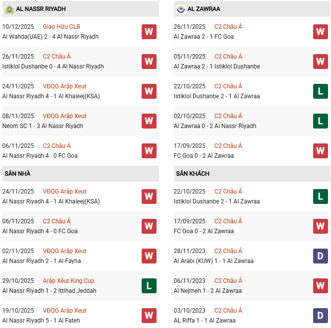 Thống kê phong độ Al Nassr vs Al Zawraa: