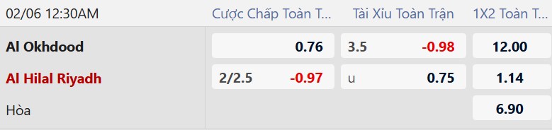 Thông tin tỷ lệ cược Al Okhdood vs Al Hilal: