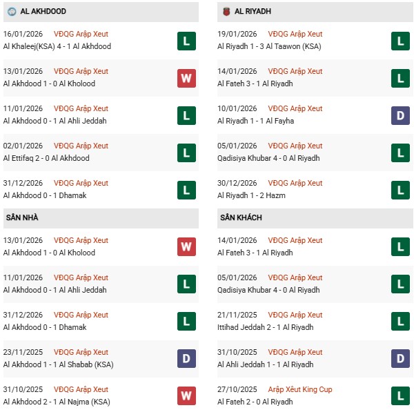 - Trên sân nhà, Al Okhdood thắng 1, thua 3 trước Al Riyadh.