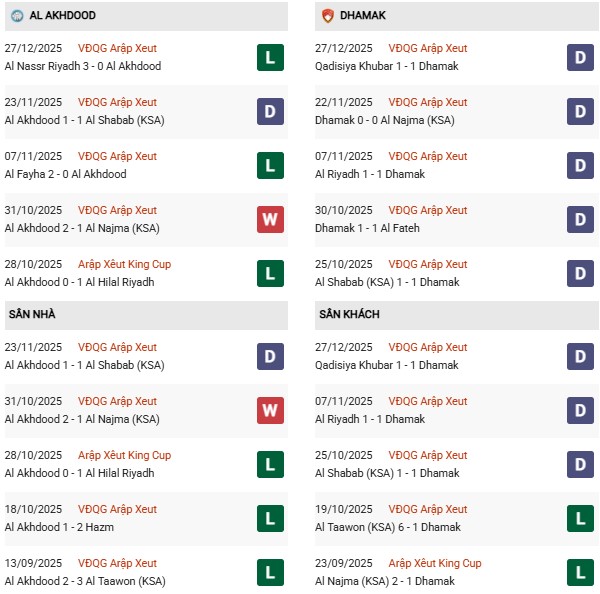- Al Okhdood hòa 1, thua 6 trong 7 trận đối đầu Damac gần đây.