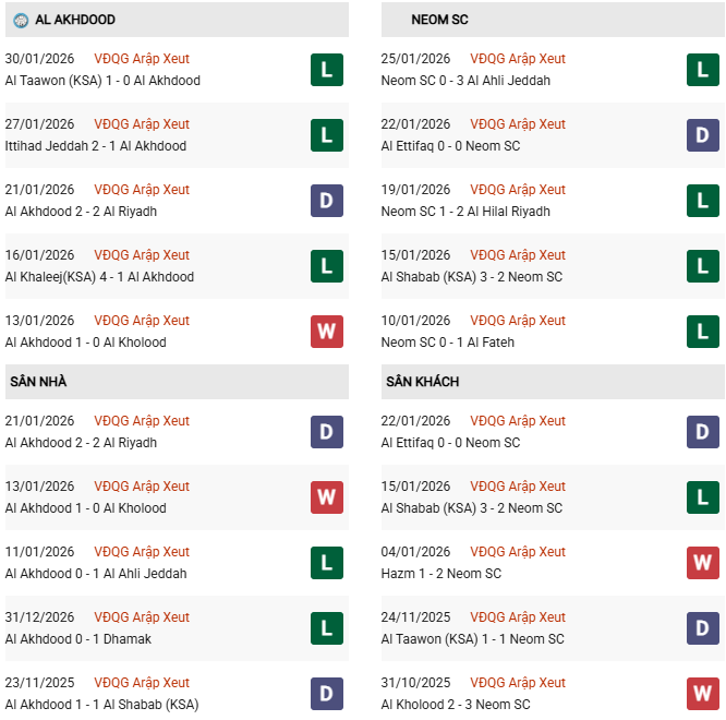 - Trên sân nhà, Al-Okhdood thắng cả 3 trận trước Neom.