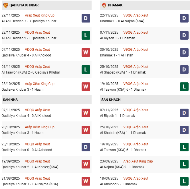 Thống kê phong độ Al-Qadsiah vs Damac:
