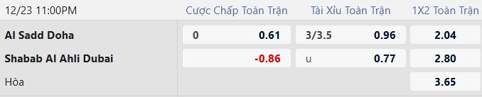 Thông tin tỷ lệ kèo Al Sadd vs Shabab Al Ahli: