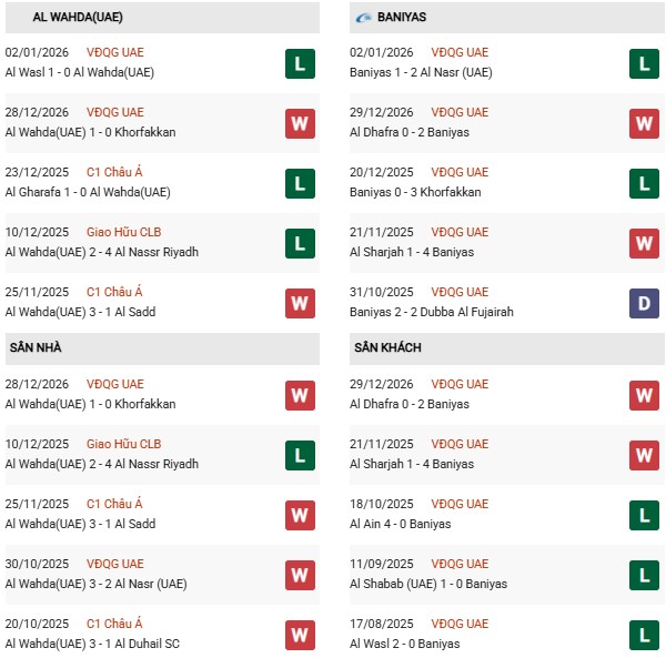 - Trên sân nhà, Al Wahda thắng 5, thua 1 trước Baniyas.
