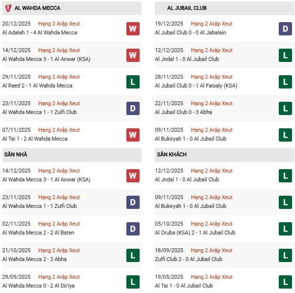 Thống kê phong độ Al Wehda vs Al Jubail: