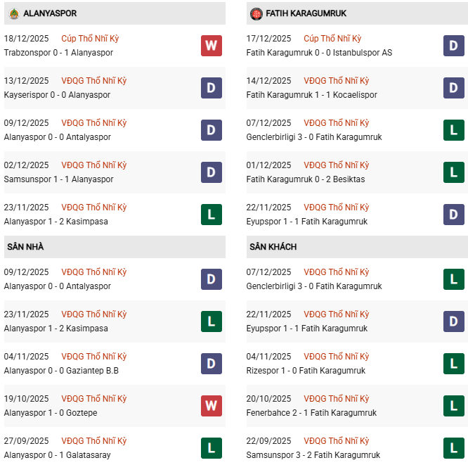 Trong 6 lần đối đầu gần nhất giữa hai câu lạc bộ, Karagumruk đang lép vế hơn đối thủ khi không thể sở hữu bất cứ chiến thắng nào và thua đến 4. Mặt khác, 4 trận đấu gần nhất Alanyaspor đang có được thành tích bất bại và thắng 2. Do đó, có thể đội khách sẽ nếm trái đắng.