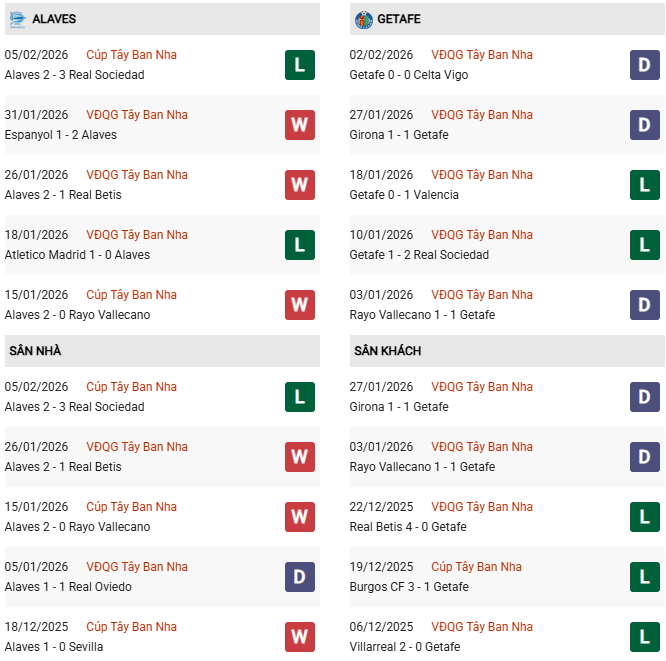 Thống kê phong độ Alaves vs Getafe: