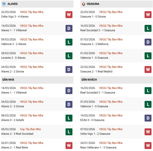 - Alaves thắng 3, hòa 2, thua 5 trong 10 trận gặp Osasuna gần đây.