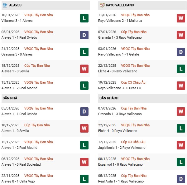 Thống kê phong độ Alaves vs Rayo Vallecano: