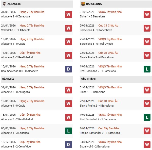 - Trên sân nhà, Albacete thua 2 trận trước Barcelona.