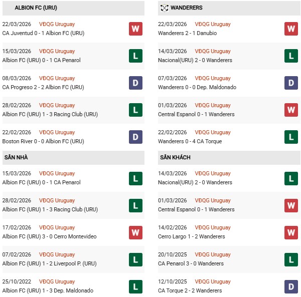 Đáng chú ý, Wanderers thi đấu sân khách khá thất thường. Họ có thể giành chiến thắng trước Central Espanol, nhưng cũng dễ dàng thất bại khi gặp các đối thủ mạnh như Nacional. Điều này khiến chuyến hành quân tới sân của Albion trở nên khó đoán hơn.