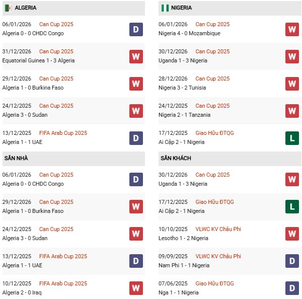 Thống kê phong độ Algeria vs Nigeria: