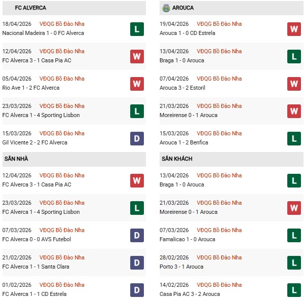 Dù phong độ sân khách của Arouca nhìn chung khá tệ với chuỗi 4 trận thua trong 5 chuyến hành quân xa nhà gần nhất, nhưng chiến thắng trước Moreirense hồi cuối tháng 3 cho thấy họ vẫn là đối thủ cực kỳ lỳ lợm khi chơi ở thế cửa dưới. Với mục tiêu cải thiện thứ hạng trong nhóm giữa bảng, Arouca chắc chắn sẽ không hành quân đến Alverca với tư tưởng buông xuôi.