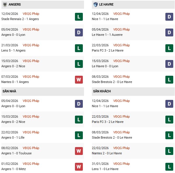 Hai đội đều sở hữu hàng công thuộc diện kém cỏi bậc nhất Ligue 1 2025/26: cùng ghi trung bình chưa đến 1 bàn/trận. Riêng Angers đã có đến 8/14 trận sân nhà mùa này hoặc sạch lưới hoặc nhận đúng 1 bàn thua. Phía đối diện, Le Havre cũng chỉ nhận tối đa 2 bàn thua ở 6/7 chuyến làm khách mới đây.