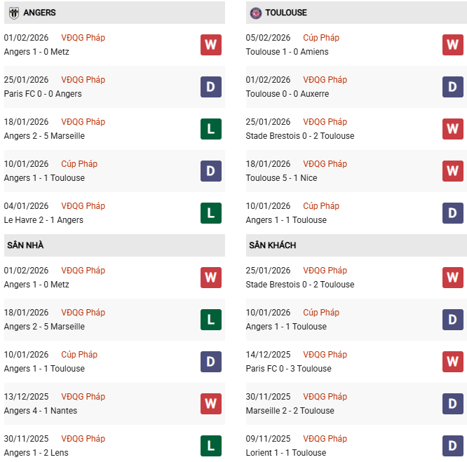 - Angers thắng 2, hòa 4, thua 4 trong 10 trận gặp Toulouse gần đây.