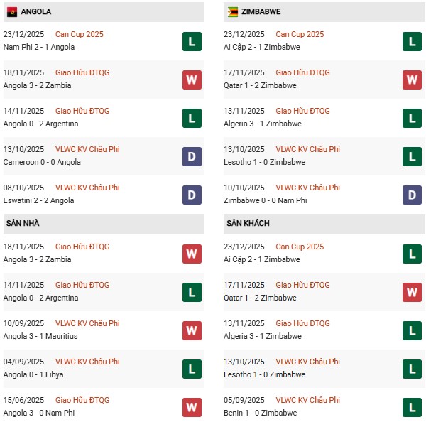 - Angola thắng 2, thua 2 trong 5 trận đối đầu Zimbabwe gần đây.