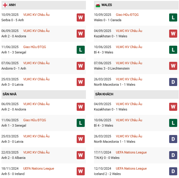 - Anh toàn thắng trong 8 trận đối đầu Wales gần đây.