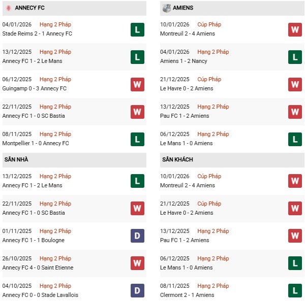 Trên sân nhà, Annecy cũng chưa mang lại cảm giác chắc chắn. Trong 10 lần tiếp khách gần đây, họ chỉ thắng 2, hòa 4 và thua 4 trận. Lối chơi của Annecy thường thiên về sự chặt chẽ, ưu tiên kiểm soát khu trung tuyến, song khả năng chuyển hóa cơ hội thành bàn thắng chưa thật sự hiệu quả. Dẫu vậy, trước một đối thủ đang chịu áp lực trụ hạng như Amiens, Annecy vẫn có cơ sở để hướng tới kết quả tích cực nếu tận dụng tốt lợi thế sân bãi.
