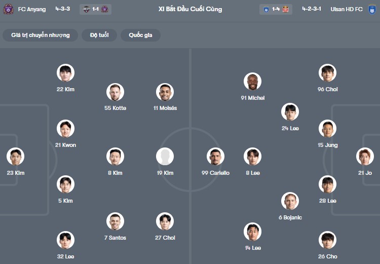 Đội hình dự kiến Anyang vs Ulsan HD: