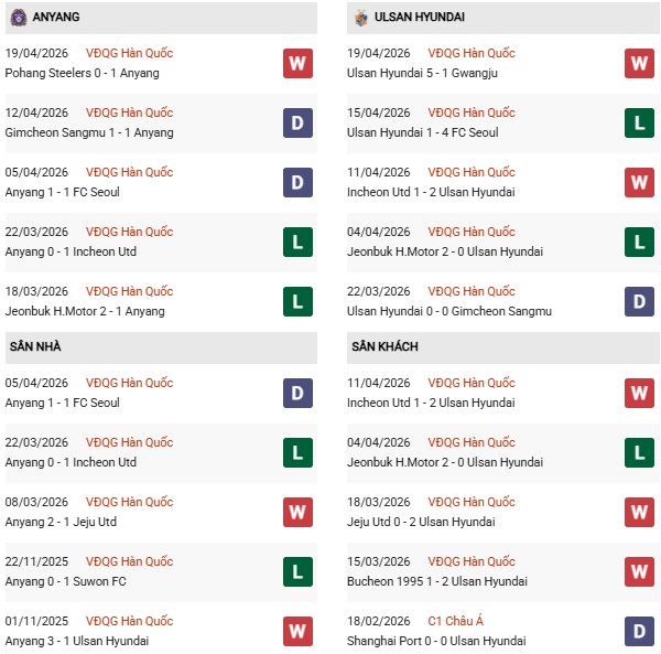 Trên sân nhà, Anyang cũng thể hiện sự ổn định khi bất bại 3/5 trận gần nhất, dù phần lớn các trận đấu diễn ra với thế trận chặt chẽ và không có nhiều bàn thắng.
