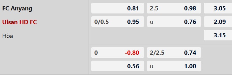 Thông tin tỷ lệ cược Anyang vs Ulsan HD: