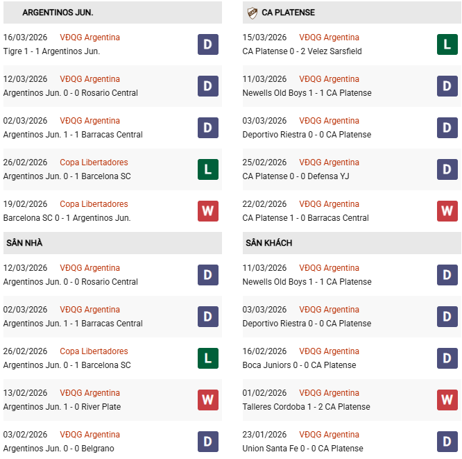 - Trên sân nhà, Argentinos thắng 3, thua 2 trước Platense.