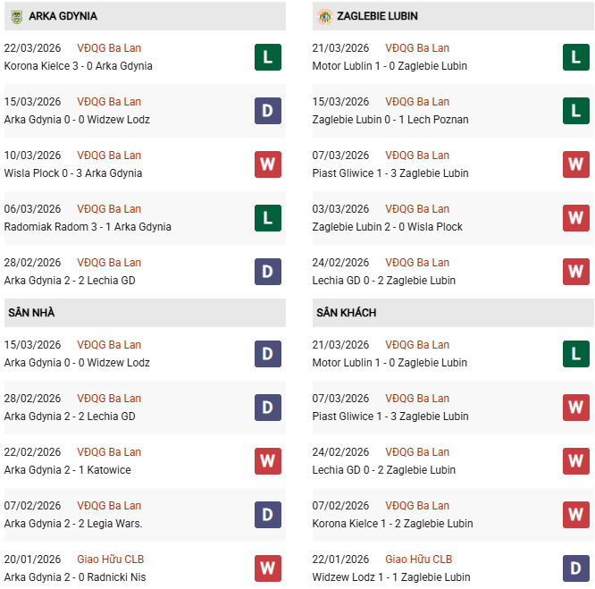 - Trên sân nhà, Arka Gdynia thắng 4, thua 2 trước Zaglebie Lubin.