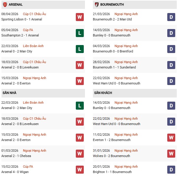 Lịch sử đối đầu tại Emirates nghiêng về Arsenal, dù Bournemouth đã tạo bất ngờ trong mùa trước và thắng 2/3 lần làm khách gần đây. Điều đó cho thấy trận đấu có thể không dễ dàng cho đội chủ nhà. Với lợi thế sân bãi, phong độ ổn định và động lực bảo vệ ngôi đầu, Arsenal vẫn được đánh giá cao hơn về khả năng giành 3 điểm.