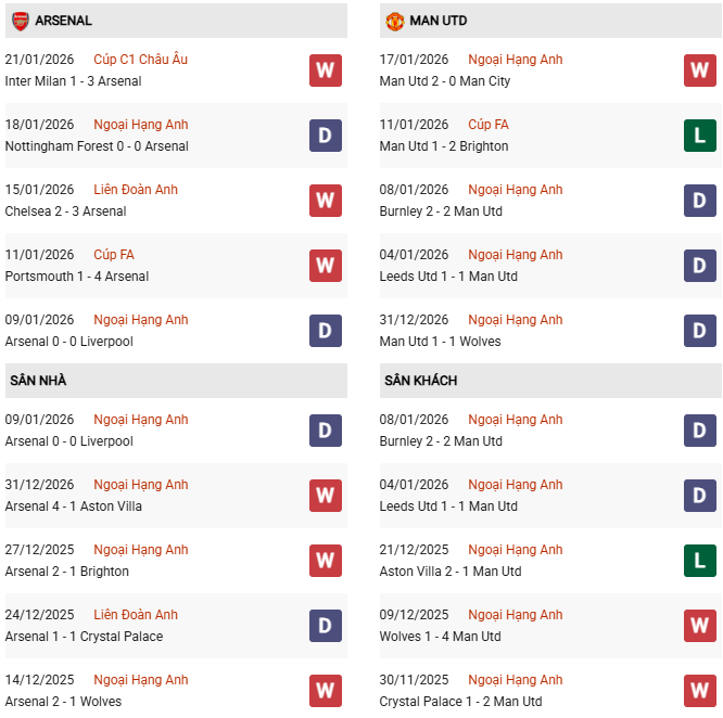 Thống kê phong độ Arsenal vs MU: