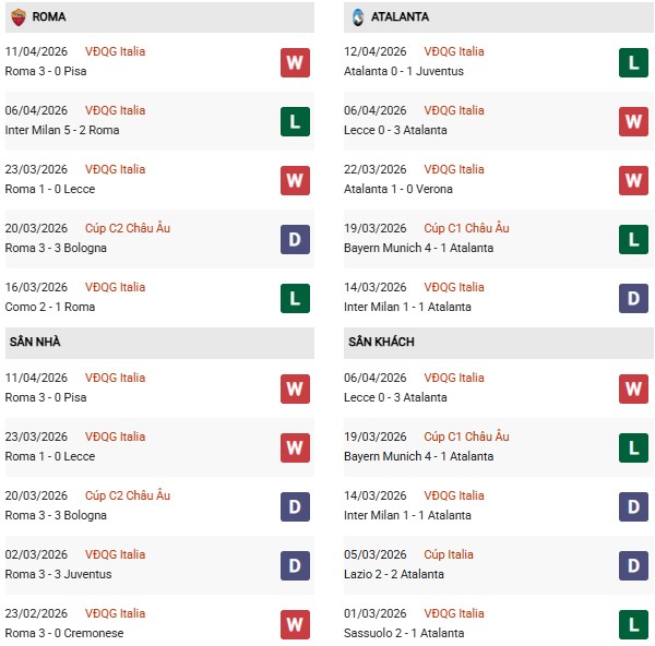Tuy nhiên, điểm yếu của Atalanta là thành tích sân khách không quá ổn định khi thường xuyên đánh rơi điểm trước các đối thủ mạnh. Hiện họ xếp thứ 7 với 53 điểm, kém chính Roma 4 điểm, nên đây có thể xem là trận “6 điểm” trong cuộc đua Top 4.
