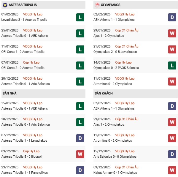 Thống kê phong độ Asteras vs Olympiakos: